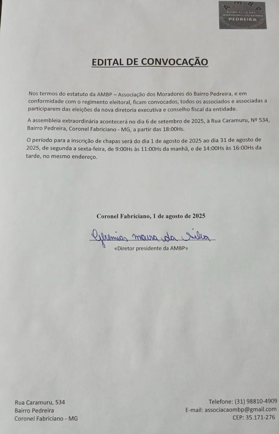 A Associação dos Moradores do Bairro Pedreira (AMBP), em Coronel Fabriciano, publicou edital convocando todos os associados e associadas para participarem do processo eleitoral que definirá a nova diretoria executiva e o conselho fiscal da entidade.